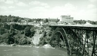 Mowat Gate (centre left) ; Clifton Hotel (upper left ; Hotel Lafeyette (upper left) ; large smokestacks in the extreme centre right background belong to the Aluminum Company of America, formerly known as the Pittsburg Reduction Company in Niagara Falls NY ; Maid of the Mist ticket office (foreground right) ;