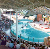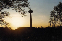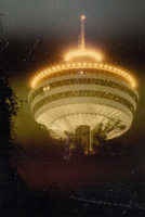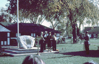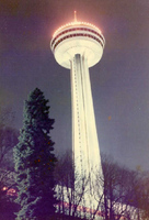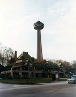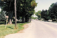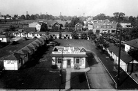 This photo was taken from a negative by Eddie Hodge. This camp is located on Buchanan South of Robinson Street, and the photo was taken from the roof of the Wire Weaving Co. These cabins were built by George Chanady who later owned and operated the Alamo Motel at the end of Victoria Avenue; Stanley Garage is in the Background