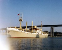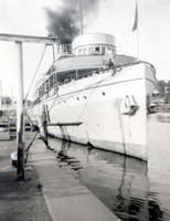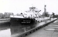 Icy tree branches at Lake Ontario near Geneva Street, seen from the Waterfront Trail. A lake ship is in the background near the Welland canal entrance.