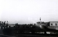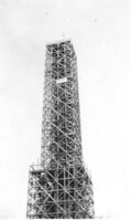 Workers repairing Brock's Monument, 1930 In 1929, during a severe storm, one of the outstretched arms of General Brock was severed. In addition the head and shoulders of the statue and the upper part of the torso were almost shattered by lightning. Extensive repairs were begun the following year. One section of the statue was completely renewed, the whole shaft pointed to make it weather proof, lightning arresters were installed and a new railing placed at the top of the column" This description is from the Review. The man in the fedora (centre) is Jim Davidson. -