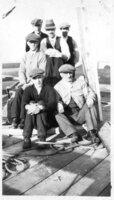 Workers repairing Brock's Monument, 1930 Workers who were repairing Brock's Monument sitting by the statue's head. In 1929, during a severe storm, one of the outstretched arms of General Brock was severed. In addition the head and shoulders of the statue and the upper part of the torso were almost shattered by lightning. Extensive repairs were begun the following year. One section of the statue was completely renewed, the whole shaft pointed to make it weather proof, lightning arresters were installed and a new railing placed at the top of the column" This description is from the Review The man in the fedora is Jim Davidson. -