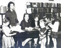 Chippawa Library Two women sitting at a desk, a third woman is standing. Four children are standing around the desk looking at books. -