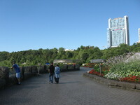 Nik Wallenda on the tightrope over the Horseshoe Falls. He was the first person in over 100 years to cross the gorge on a tightrope and the first to go over any portion of the falls. He began his walk on the American side at 10:15 p.m. and completed the walk in 25 minutes. Near the end of his journey he bent to one knee and pumped his fist in the air.