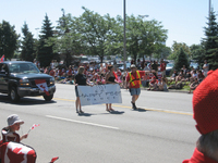 Canada Day 2011 City of Niagara Falls celebrations at Optimist Park Float looking like a giant peach basket carries the Peach Queen, Princesses and other contestants ; advertising on side of float is for Winona Peach Festival Last weekend in August ; -