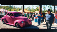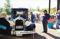 A small boat in foreground next to the dock ; people sitting on dock ; Greenwood's Boat House (centre right) ; smaller boat houses along the creek bank in upper part of image ;