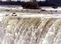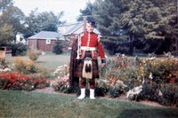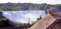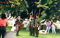 Boat house belonging to George Bukator centre, crowds lining the bank of Chippawa Creek and sitting on top of the boathouse roof ; Laura Secord's residence 2 in upper left, old railway bridge in distance (right) ; baseball players balancing on water boards centre and right ;