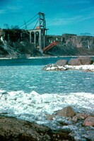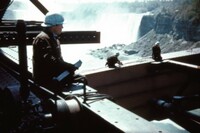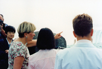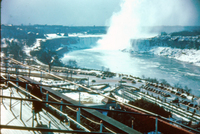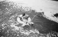 Two women identified as Helen Rapeljie in the stern and Eleanor Bukator in the bow ; electric railway poles in background ; verification of identity provided by Eleanor Bukator February 9 1975 ;