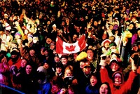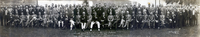 Band members of the CEF are in the foreground, some wearing kilts and carrying bag pipes, others carrying drums and other musical instruments ; troops dressed in khaki , head gear is Australian type slouch hat ; other troops in background ;