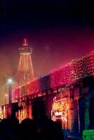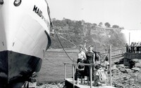 Maid of the Mist in front of American Falls ; Horseshoe Falls in background centre ; Clifton Hotel right, streetcar of the Great Gorge Railway centre ;