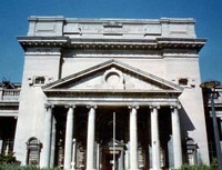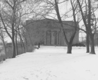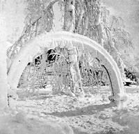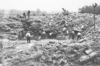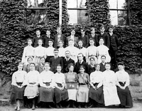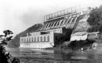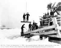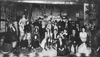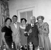 Members of the Niagara History & Trivia Facebook group suggested possible information about this photo in June 2015 : 48 stars on US flag suggests pre-1959. Woman in back row : Winnifred Stokes Hill, managing editor of the Review. Possibly Ron Roels, photographer, back row right. Harry Rustige, Fort Erie correspondent, front row far left. "Skip" Bill Johns, front row, 5th from right. Doug Austin, front row third from right. Possibly a former mayor, front row, second from right. Ruby Sibbett Lindsay, women's editor, second row, 4th from right. Other woman, possibly Eva Tolan. It looks like a party of Niagara Falls Review newspaper staff.