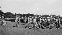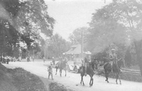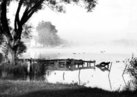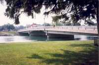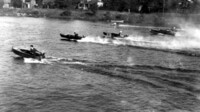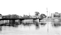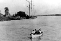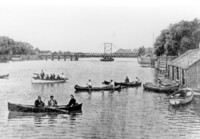 Five canoes are shown boating in Chippawa Creek, The MCR [Michigan Central Railway bridge is in the background ; Left front canoe inlcudes: Thomas Greenwood, Louise Ackerman, Mrs. Greenwood; Left Upper Canoe: Thomas Downey & unknown; Upper right canoes': Hardy Gerber & Deak Greenwood ; tw small motor boats are shown tied up at the boat house centre right ;
