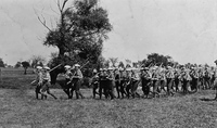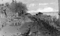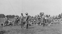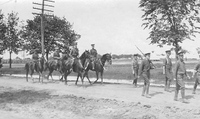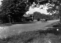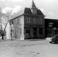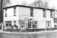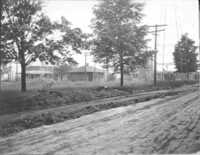A two storey house is located left ; businesses in the house are E G McNally Drugs and Furniture Warerooms ; a man is standing ouside the awning over the drug store wearing short sleeved shirt and dark pants ; railway tracks in foreground ; dirt road is lined by mature trees ; another business partially hidden by trees is located right ; this building was also the site of the original Royal Bank in Chippawa ;