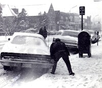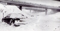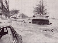 Car buried and snowmobiles used during rescues during the Blizzard of 77