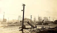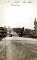 hand written note on back indicates last section of Falls View Bridge being carried downstream, sunk opposite Sewage Disposal Plant (Seneca St) in 175 ft of water April 1938