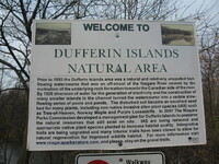Dufferin Islands Welcome Sign Dufferin Islands welcome sign : "Welcome to Dufferin Islands Natural Area. Prior to 1903 the Dufferin Islands area was a natural and relatively unspoiled fast-flowing watercourse that was an off-shoot caused by the inclination of the underlying rock formation towards the Canaddian side of the river. By 1920 diversion of water for the generation of electricity and the construction of many smaller islands in the channel turned the watercourse into a sedate, slow-flowing series of pools and ponds. the disturbed soil became an excellent seed bed for many plants, insluding non-native invasive alien plant species (IAS) such as Tree-of-Heaven, Norway maple and Purple Loostrife. In 2007 the Niagara parks Commission developed a management plan for Dufferin Islands to preserve the natural resources that still exist on the site. IAS are being removed and appropriate native plant species planted to increase the habitat quality. Interpretive trails are being upgraded and many interior trails have been closed to allow for natural regeneration for improved wildlife habitat. For more information visit www.Niagaraparksnature.com and please, stay on the gravel trails." -