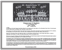 Chippawa Junior ‘C’ RiverHawks O.H.A. Champions 2001 Front Row L-R ; Andy Cloutier Equipment Manager, Dave Bitner, Robert Orr, Tim Velemirovich, Beau Spencer, Chris Chudobiak, Chad Collins, Tim Morningstar, Blue Hill, Kellen Mowat, Joe DeCarlo, Matt Catherwood, Claude Cloutier Equipment Manager. Second Row L-R; Al Boone General Manager, Winston Auld Manager, Scott Paul, Brad Auger, Tyler Barath, Jason Shawana, Bill Kostuk Assistant Coach, Neil Alderton Statistician, Chris Johnstone Coach, Don Edwardson Assistant Coach, Tom Kelly Assistant Coach, Ron Potter Statistician, Jamie Floris, Byron Harding, Ben Thomas, Sean Milton, Kristen Jarvis Trainer, Otto Lutz Volunteer. Back Row L-R ; Day Hannah Doctor Executive, Bill Leskiw (Doctor William) Owner, Ken Moore Executive, Tim Chamberlain Volunteer, Michel Dompierre Trainer, Richard Anger , Mike Rybiak, Tom Barath, Matt Baglieri, Matt Roberts, Jim Hess Sponsor, Fred Sacco Owner, Butch Sacco Executive, Jeremy Lowe Advertising, Buddy Lowe Owner. -