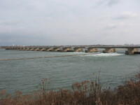 International Control Dam The international control dam in the upper Niagara River with the Niagara Falls skyline in the background. -