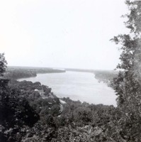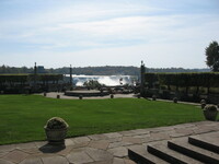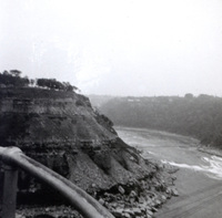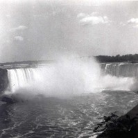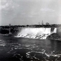 William "Red" Hill Junior in the "Thing" in the lower Niagara River with the Falls in the background. He would die on August 5, 1951 after going over the Horseshoe Falls in it.