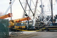 Giant Ferris Wheel at Maple Leaf Village Amusement Park Niagara Falls Being Torn Down Tubular steel supports of the Giant Ferris Wheel ; construction worker in cherry picker amongst the struts (centre left) ; blue box car in background (bottom right ; -