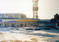 Maple Leaf Village Amusement Park Niagara Falls Large advertising sign left, advertises Shops, Shows, rides eats and fun! Kodak Tower visible centre ; snow on ground ; -