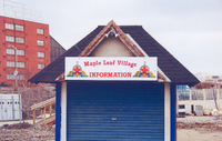 Maple Leaf Village Amusement Park Niagara Falls Information Booth Small booth structure with a shingled roof serving as the Information booth for the park ; Travelodge Hotel (background left) ; construction debris right ; -