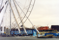 Maple Leaf Village Amusement Park Niagara Falls being torn down Heavy construction equipment including cranes (left) ; tubular steel supports of the Giant Ferris Wheel and part of the ride (centre and right) ; van parked (right) ; Skylon Tower partially visible through the base of the ride (top right) ; -