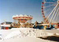 Dixie Dangler Swing Ride at Maple Leaf Village Amusement Park Niagara Falls The Dixie Dangler Swing Ride (centre) ; Canadian Cookhouse (centre right) ; the Giant Wheel (top right) ; turreted towers of the park entrance right of the wheel ; snow on ground ; -