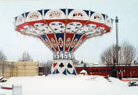 Dixie Dangler Swing Ride at Maple Leaf Village Amusement Park Niagara Falls The Dixie Dangler Swing Ride (centre) is shown in the process of being dismantled, all swings are gone; orange rail car in background housed the park offices ; snow on ground ; -