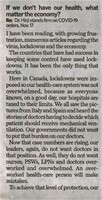 If we don't have our health, what matter the economy? Re: Dr. Hirji stands firm on COVID-19 orders, Nov. 17