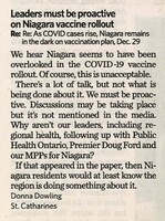 Leaders must be proactive in Niagara vaccine rollout Re: Re: As Covid cases rise, Niagara remains in the dark on plan, Dec. 29