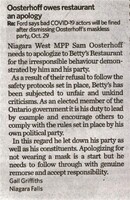 Oosterhoff owes restaurant an apology : Re: Ford says bad COVID-19 actors will be fined after dismissing Oosterhoff's maskless party, Oct. 29