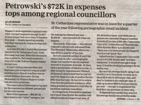 Petrowski's $72K in expenses tops among regional councillors : St. Catharines representative was on leave for a quarter of the year following pornographic email incident