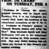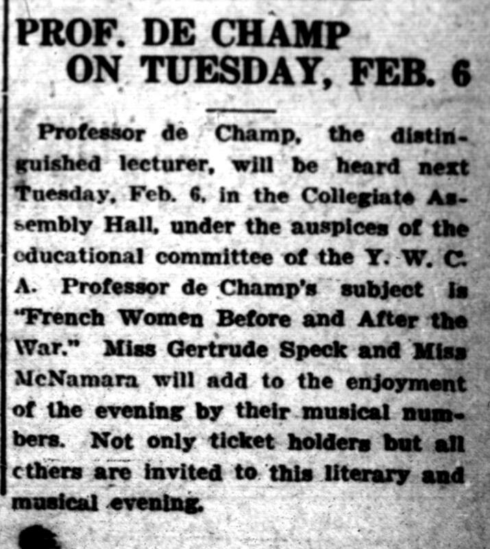 - en-CA Professor De Champ / Y.W.C.A. / Miss Gertrude Speck / Miss McNamara / French women