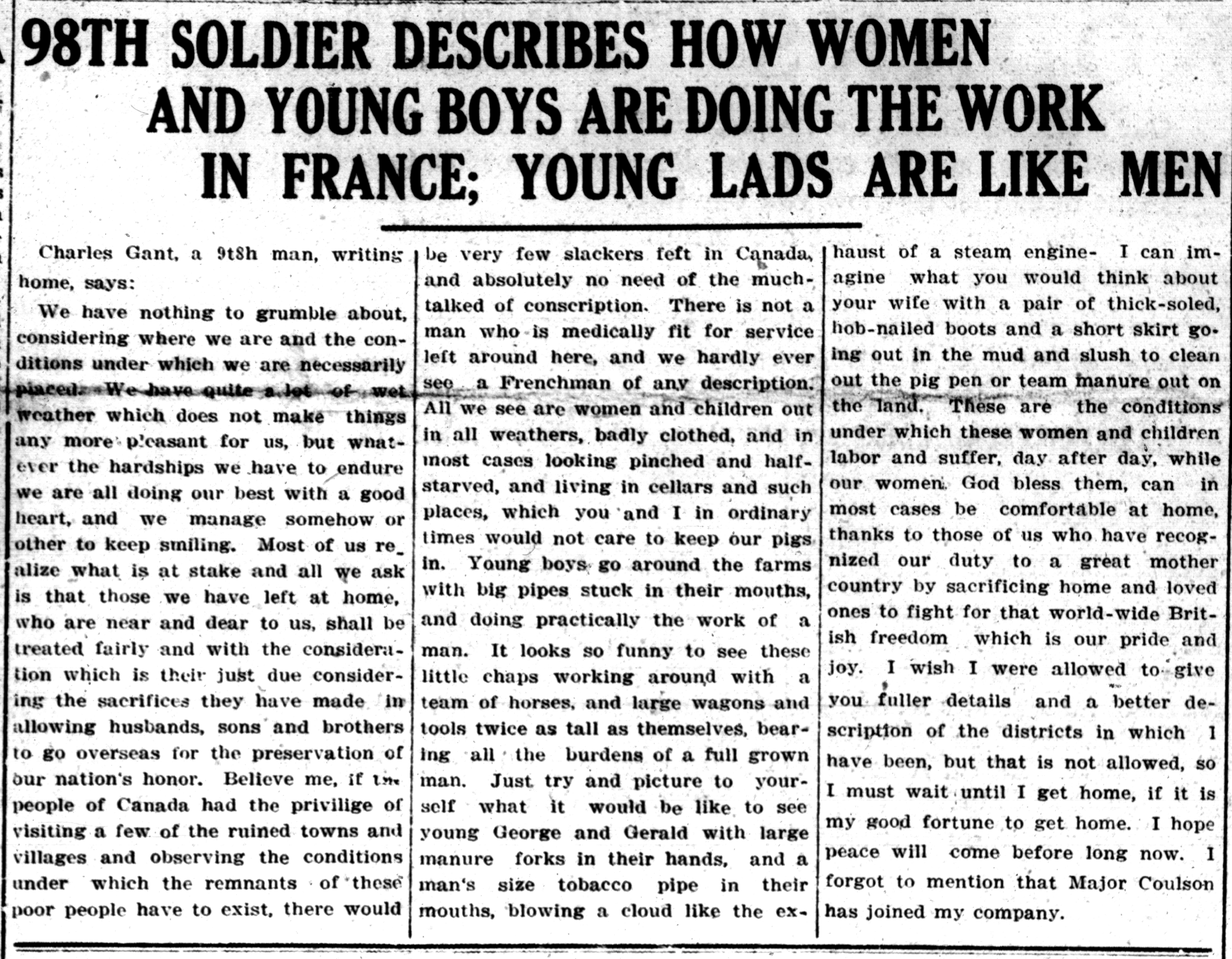 98th soldier describes how women and young boys are doing the work in France; Young lads are like men