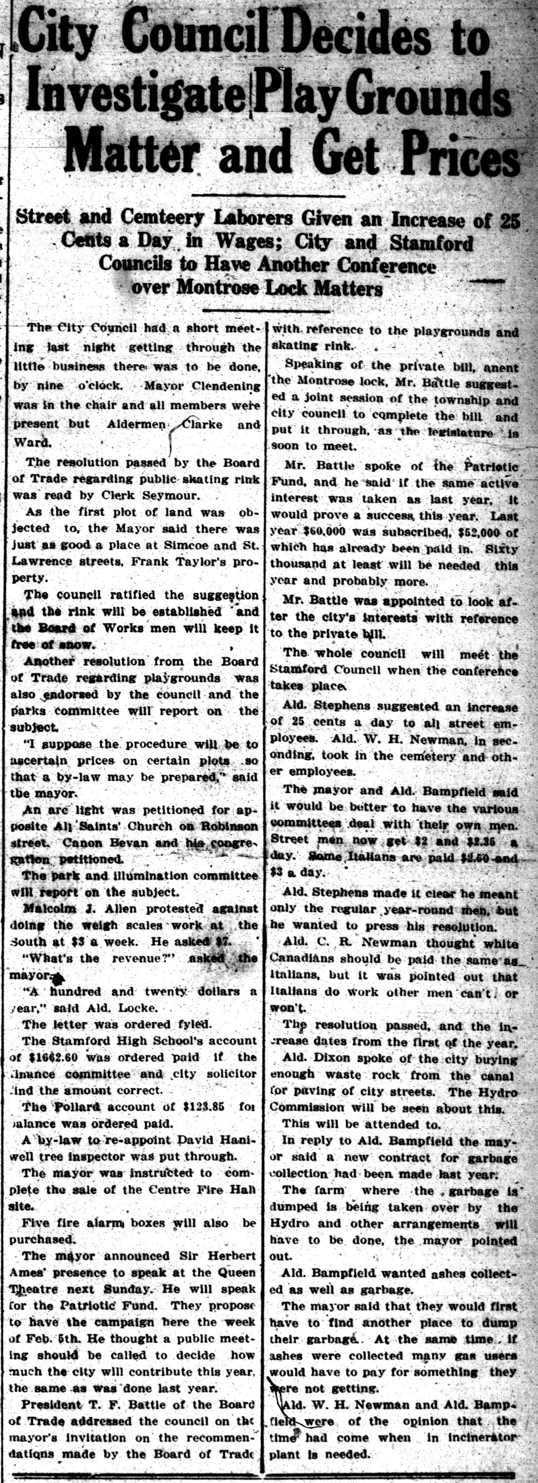 - en-CA Sir Herbert Ames / Canadian Patriotic Fund campaign / President T.F. Battle of the Board of Trade / Alderman Bampfield / Mayor Clendening / Alderman Clarke / Clerk Seymour / Frank Taylor / Canon Bevan / All Saint's church / Malcolm J Allen / Alderman Locke / Stamford High School / Pollard Account / David Haniwell / Centre Fire Hall / Stamford Council / Alderman Stephens / Alderman W.H. Newman / Alderman C.R. Newman / Alderman Dixon / Garbage collection