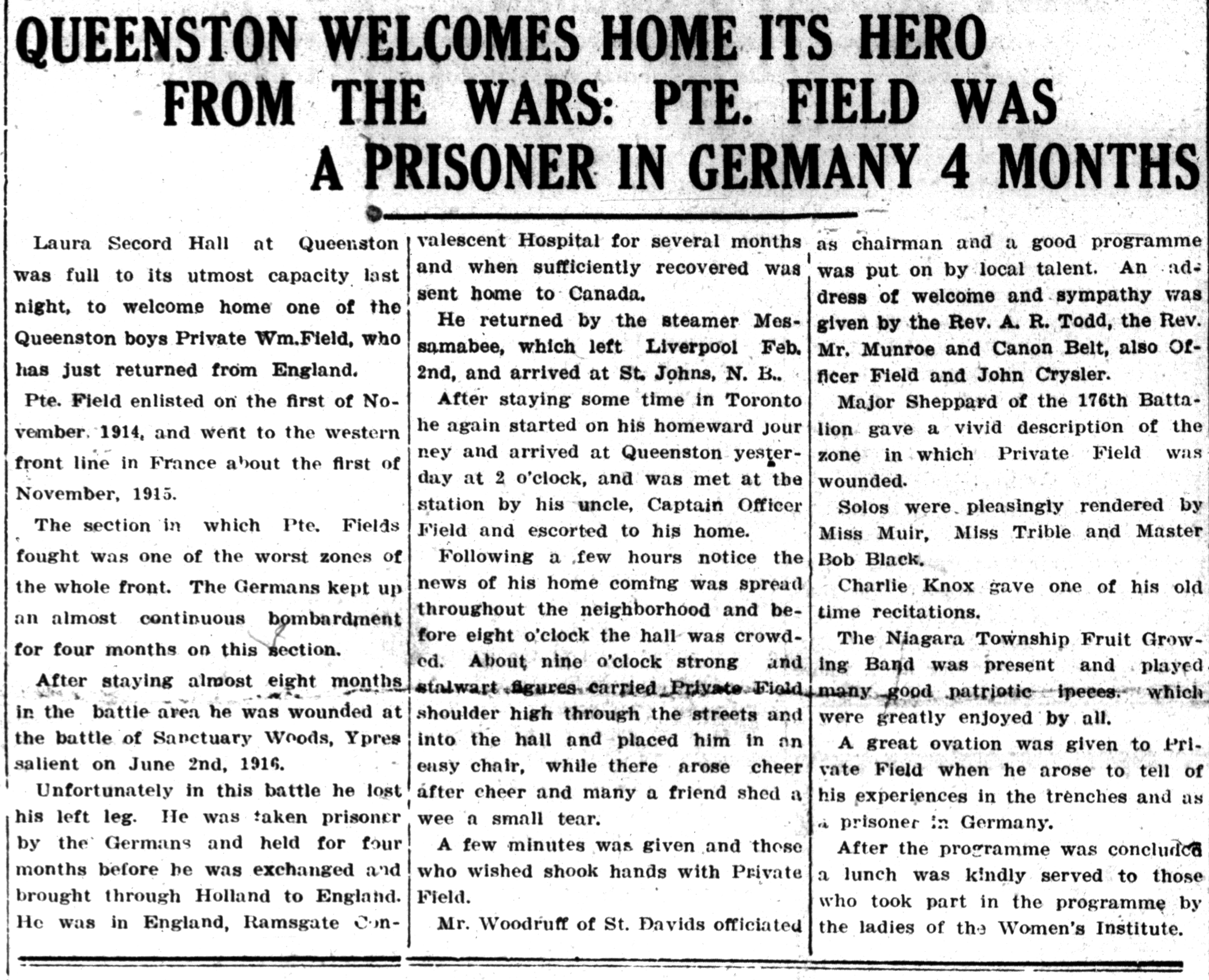 - Queenston welcomes home its hero from the wars: Pte. Field was a prisoner in Germany 4 months