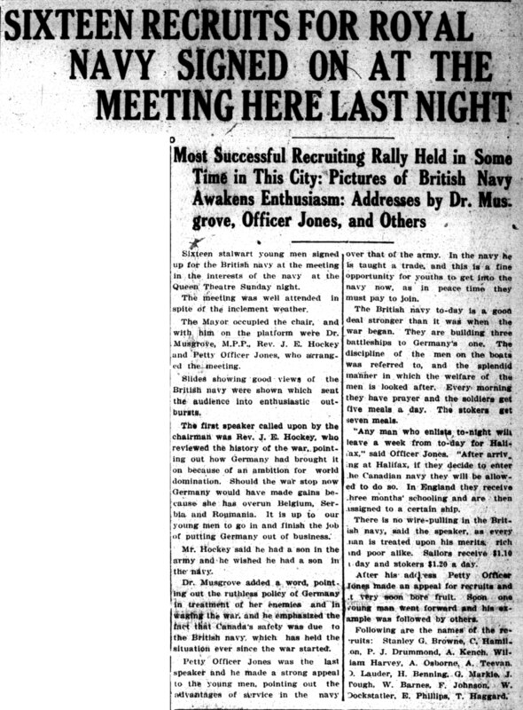 - en-CA Dr Musgrove M.P.P./ Petty Officer Jones /Rev. J.E. Hockey / Stanley G. Browne / C. Hamilton / P.J. Drummond / A. Kench / William Harvey / A. Osborne /A. Teevan / O. Lauder / H. Benning / G. Markle / J. Tough / W. Barnes / F. Johnson / W. Dockstatler / E. Phillips / T. Haggard