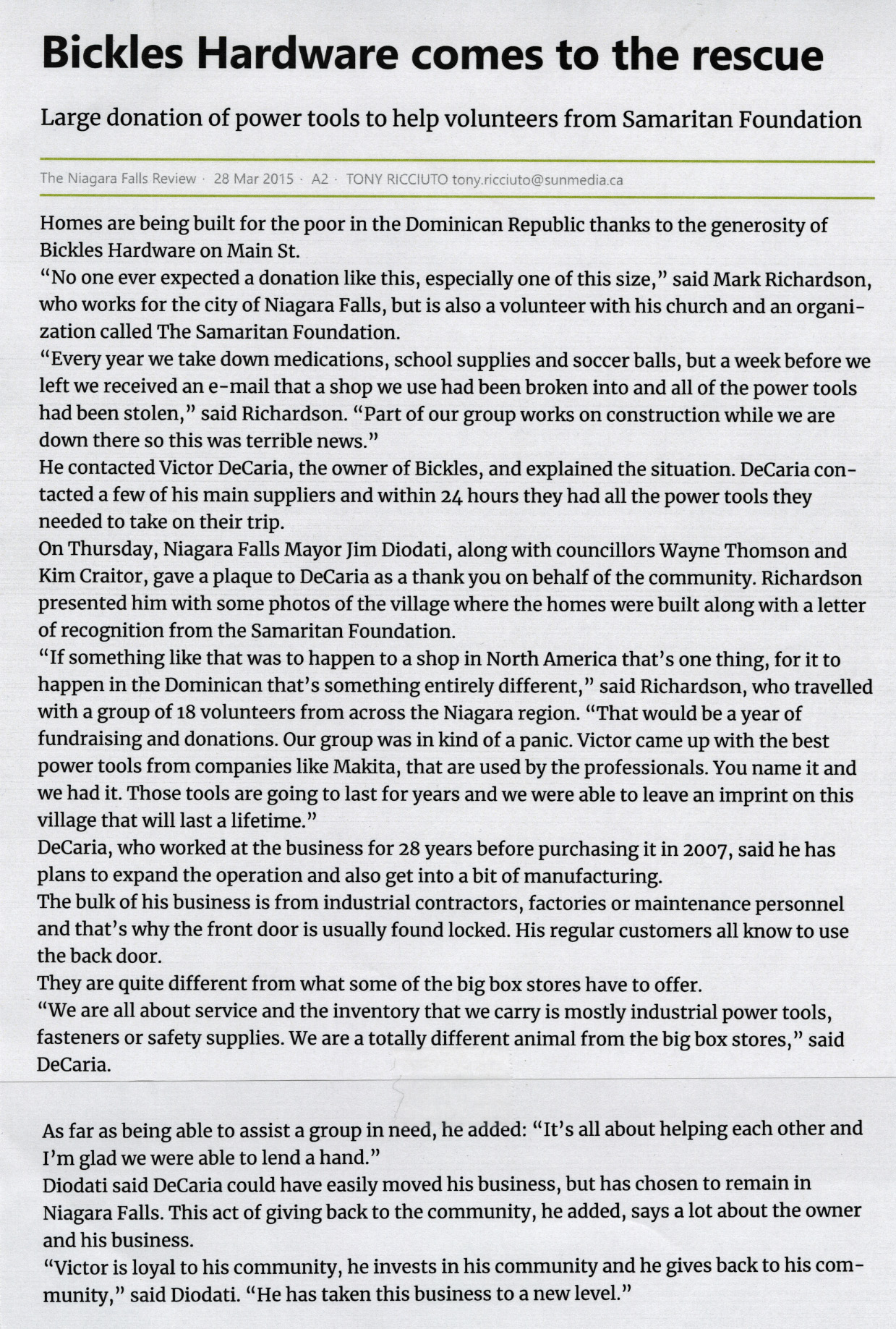 - Bickles hardware comes to the rescue : large donation of power tools to help volunteers from Samaritan Foundation