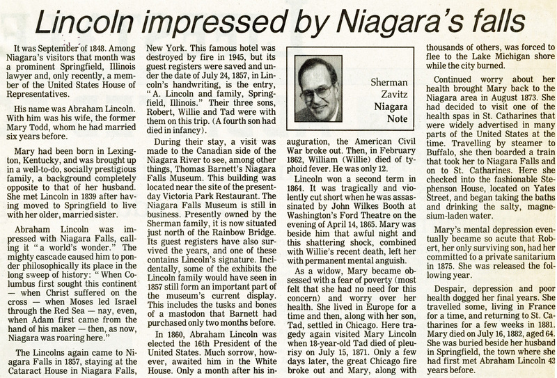 - Zavitz, Sherman / Lincoln, Abraham / Todd, Mary / Cataract House / Thomas Barnett's Niagara Falls Museum / Victoria Park Restaurant / Sherman Family
