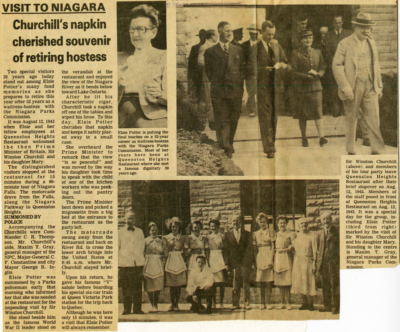- Visit to Niagara : Churchill's napkin cherished souvenir of retiring hostess