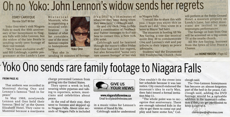 - Ono, Yoko / Lennon, John / 40th Anniversary of her honeymoon / Video Footage / Colclough, Bill / Lundy's Lane Historical Museum / Iorfida, Dean/ Salci, Ted / Beatles