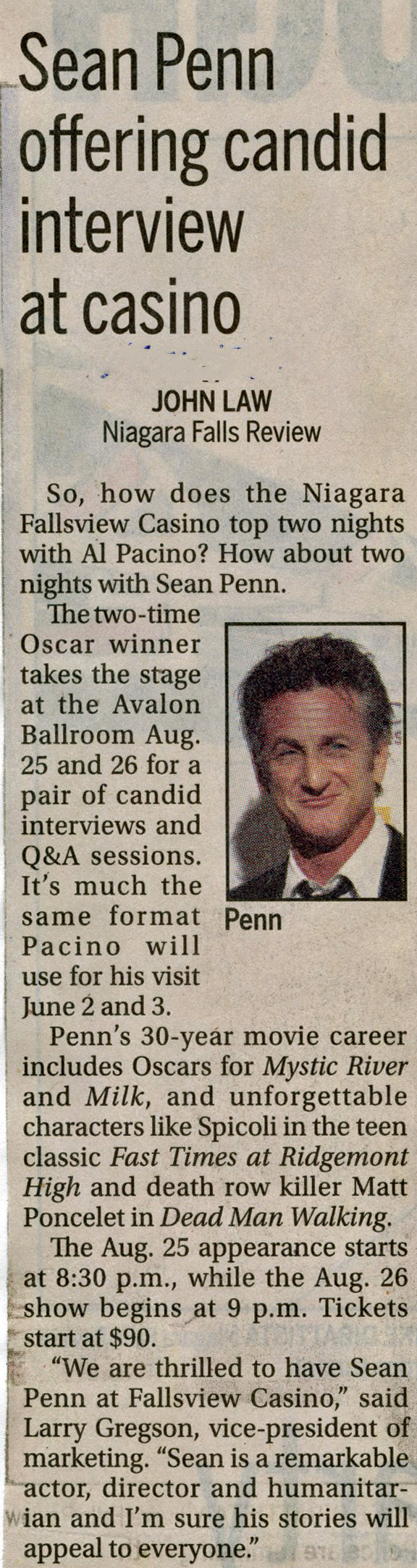 - Penn, Sean / Niagara Fallsview Casino / Gregson, Larry / Mystic River / Milk / Dead Man Walking