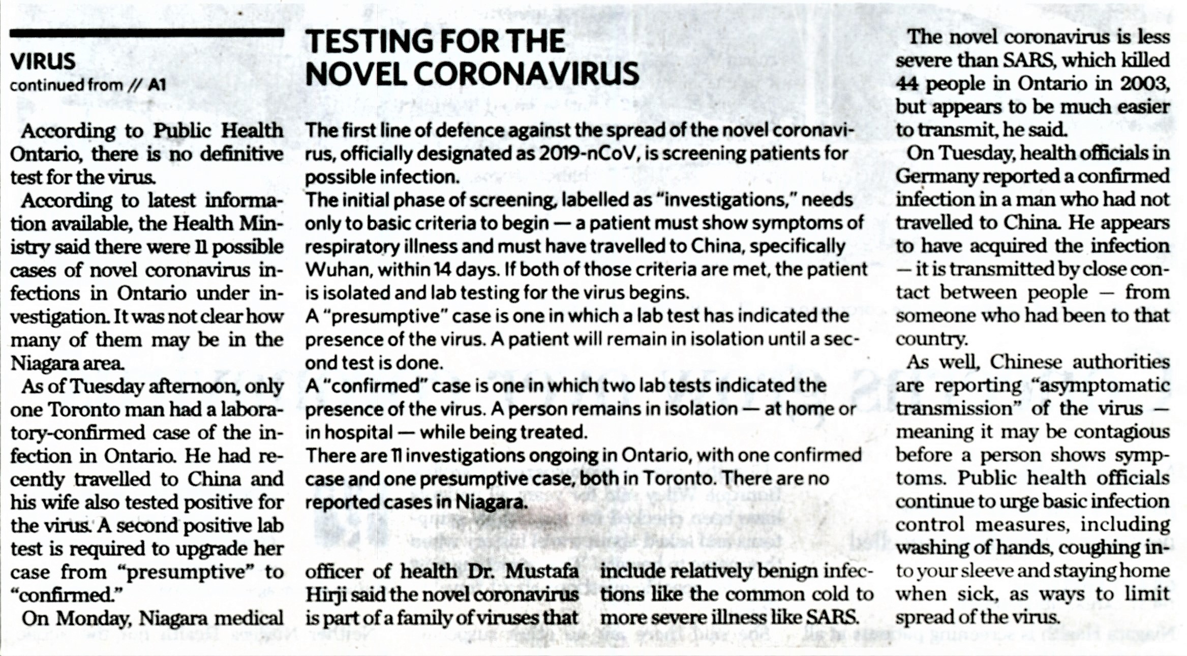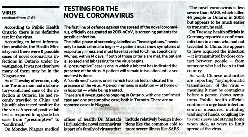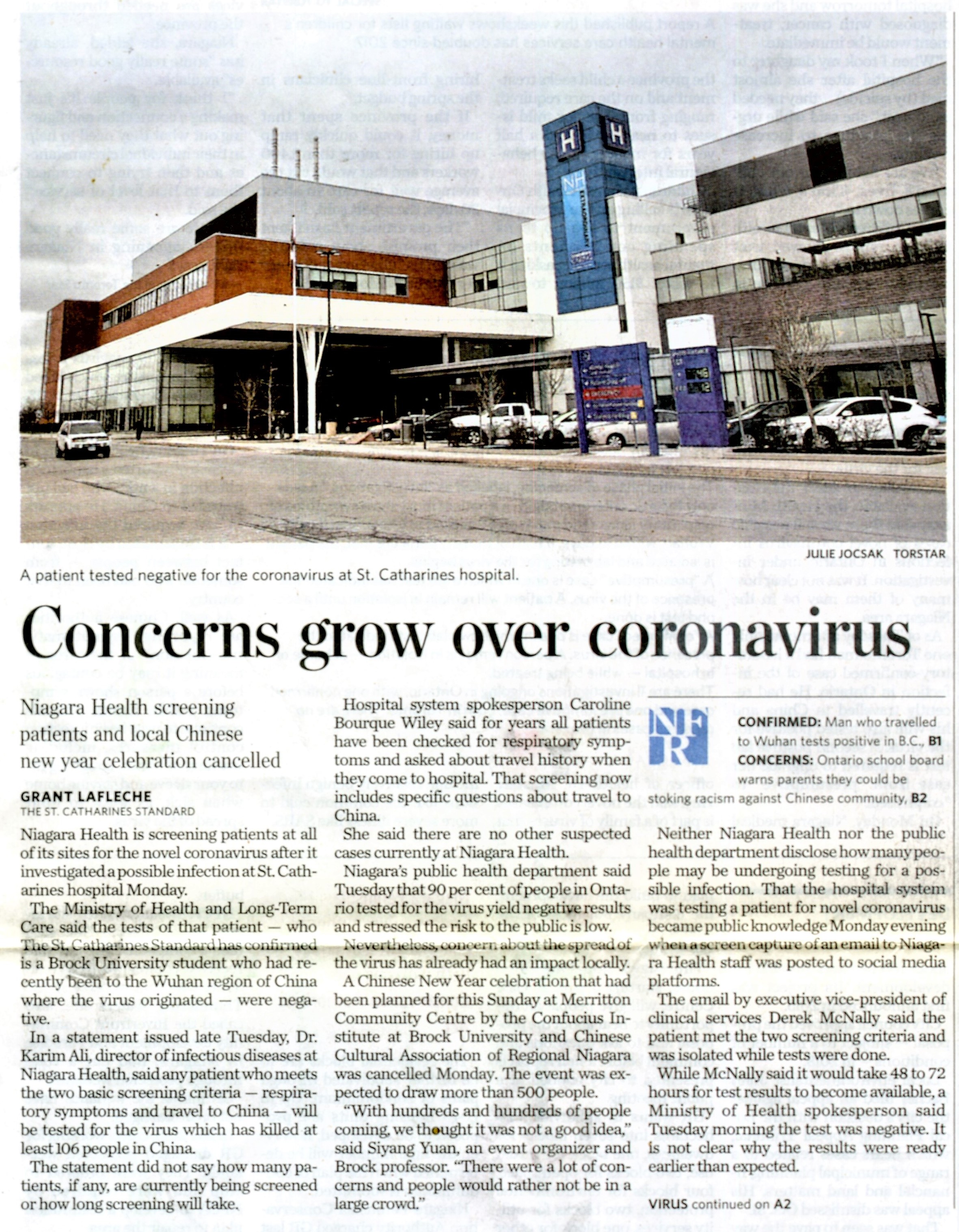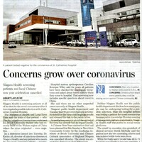 - Concerns grow over coronavirus : Niagara Health screening patients and local Chinese new year celebration cancelled