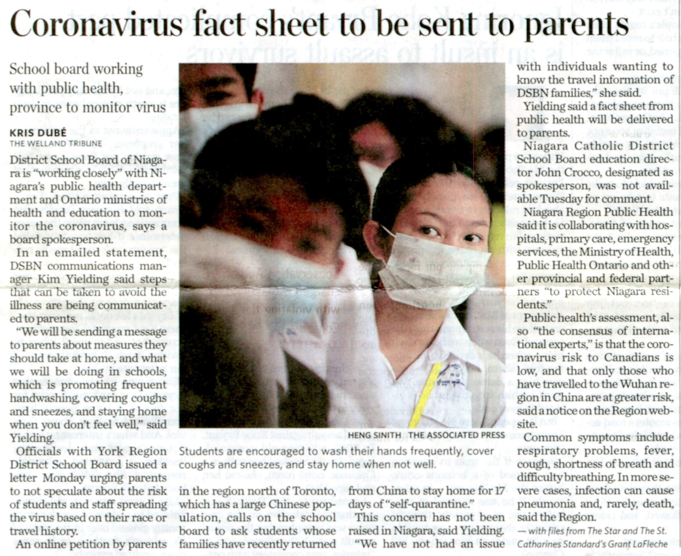 - Coronavirus fact sheet to be sent to parents : school board working with public health, province to monitor virus