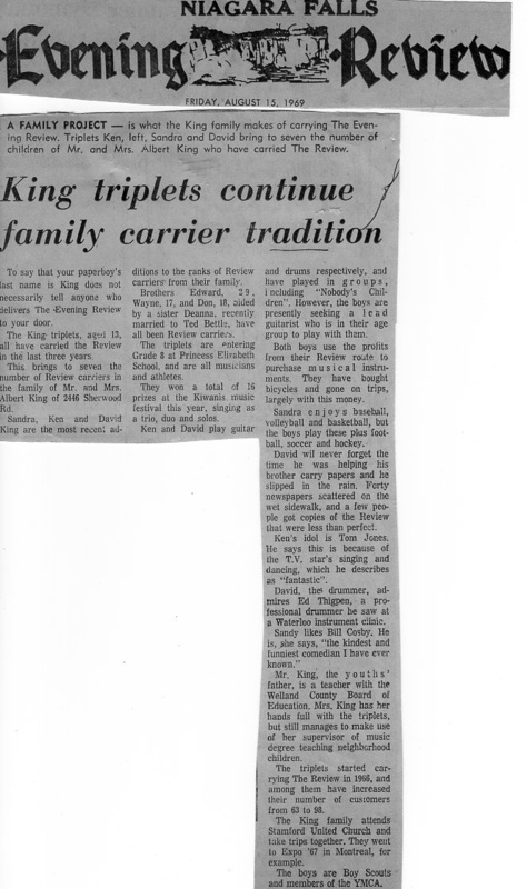 - King Triplets /The Evening Review / Review Carriers / Mr. & Mrs. Albert King / King, Sandra / King,, David / King, Ken / Princess Elizabeth School / Stamford United Church