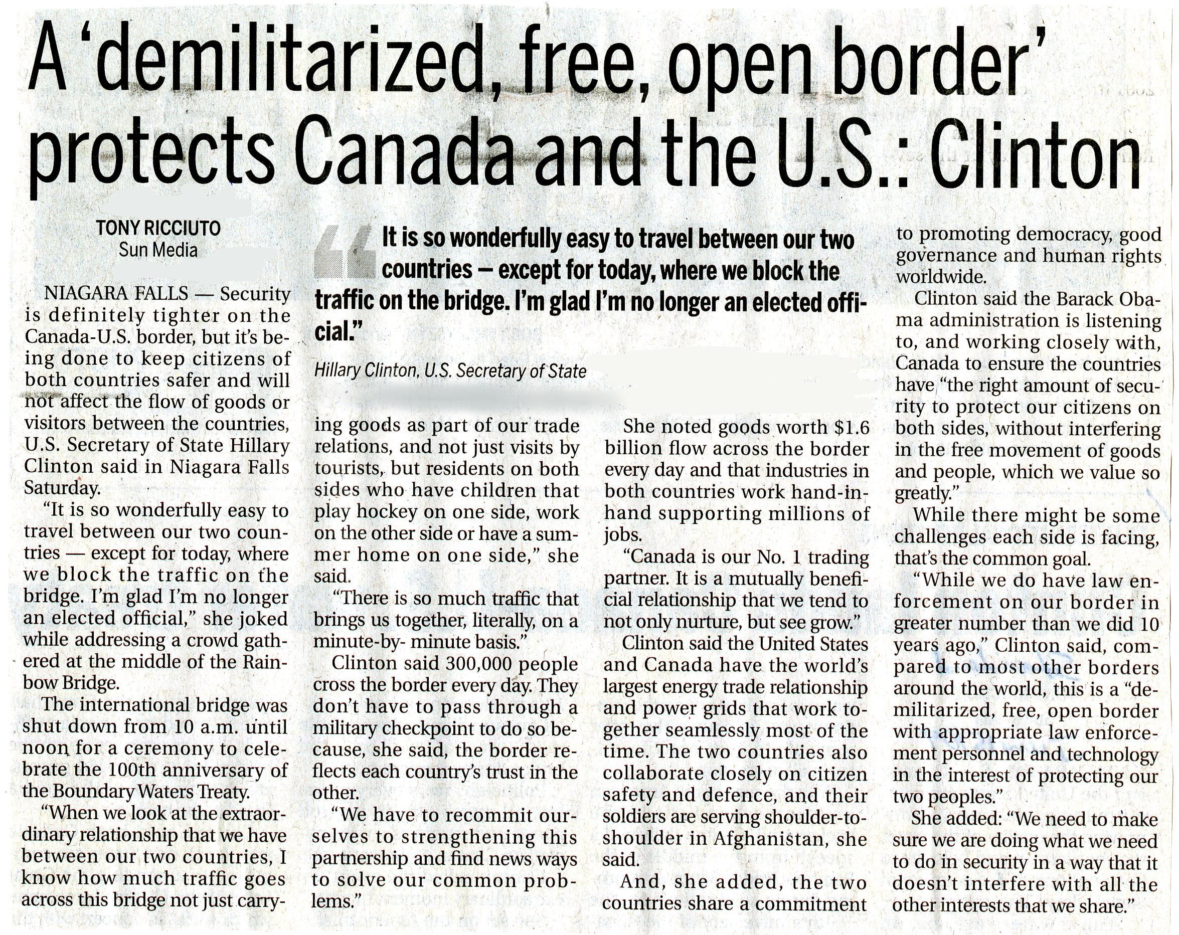 - A 'demilitarized, free, open border' protects Canada and the U.S. : Clinton