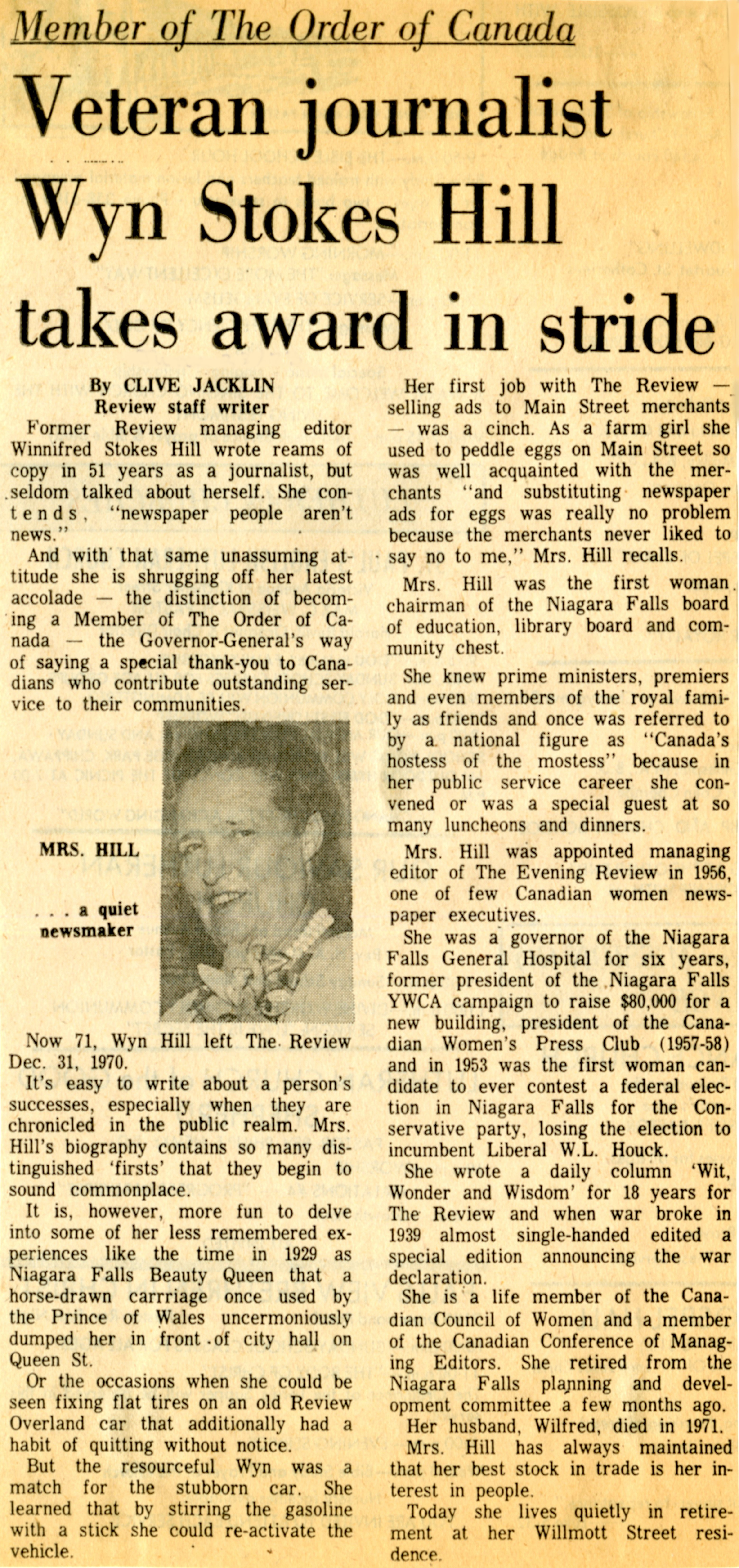 - Member of the order of Canada : Veteran journalist Wyn Stokes Hill takes award in stride