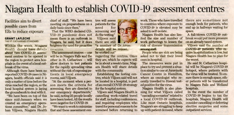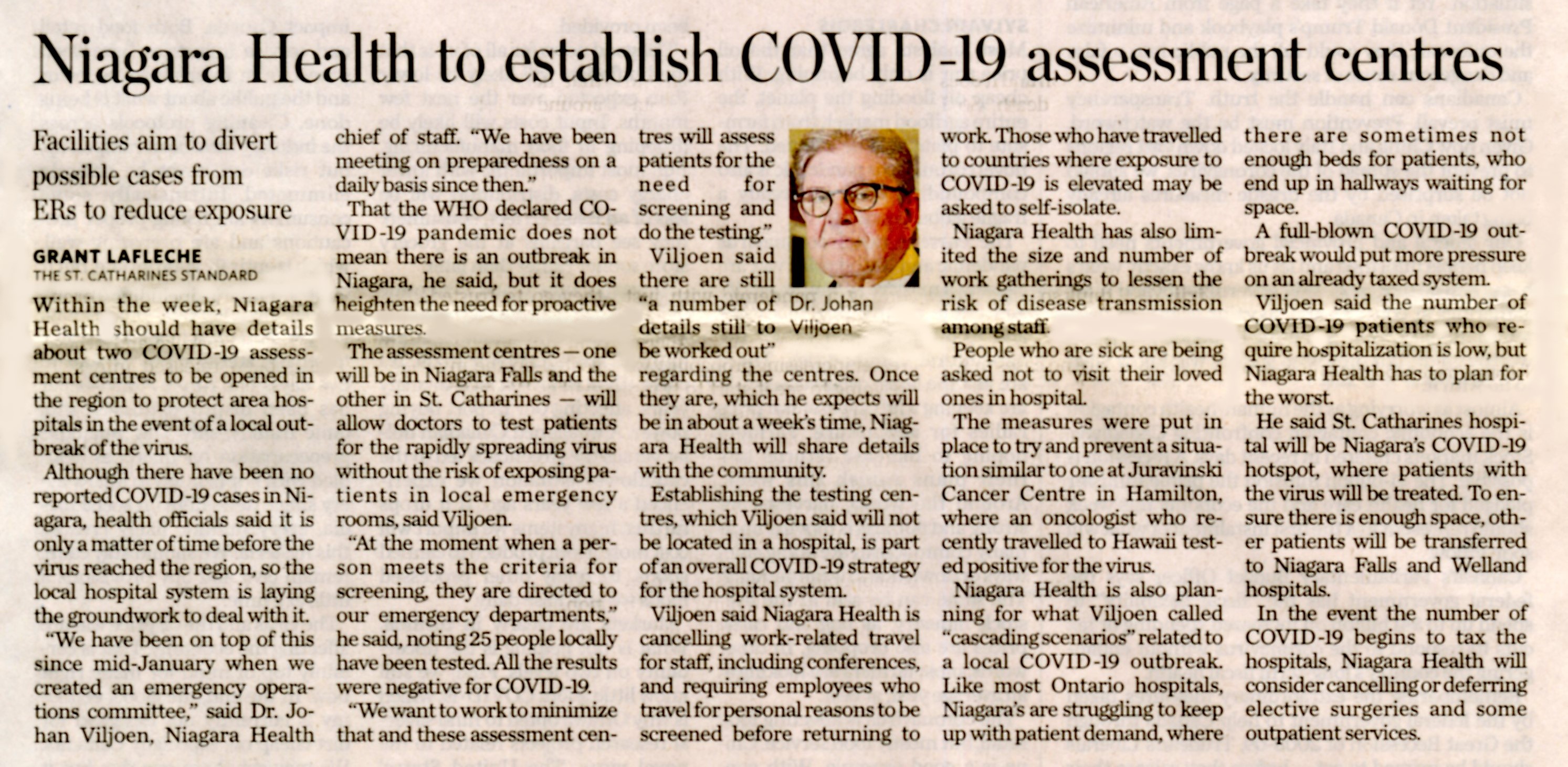 Niagara Health to establish COVID-19 assessment centres : facilities aim to divert possible cases from ERs to reduce exposure