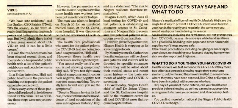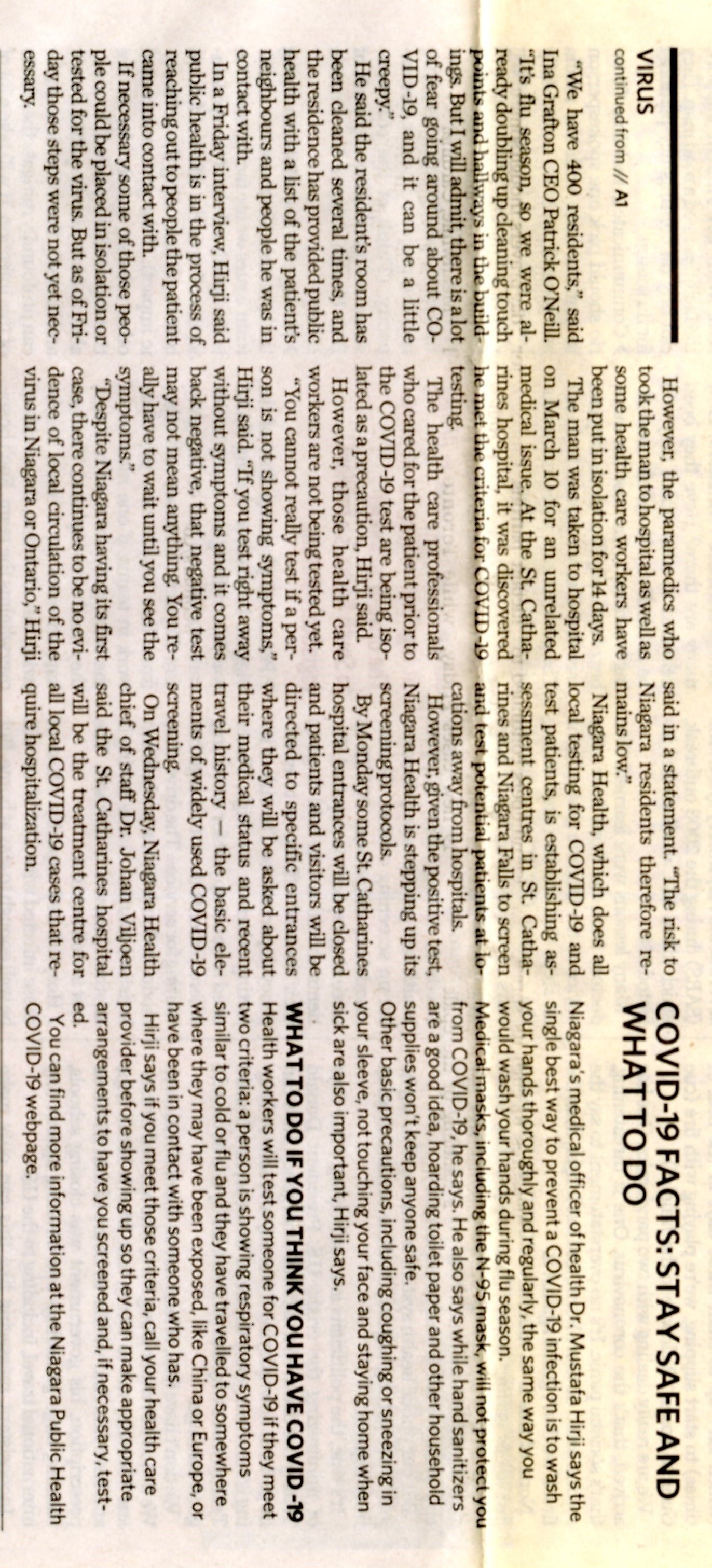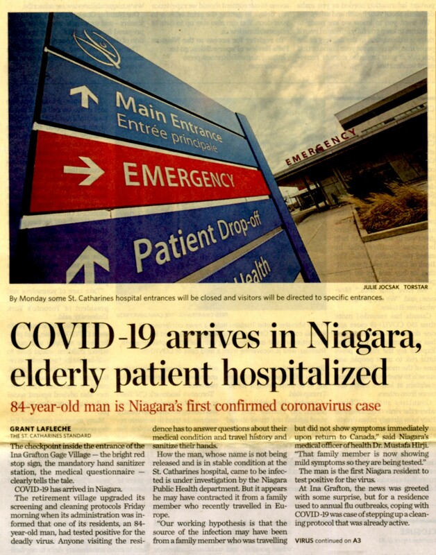 COVID-19 arrives in Niagara, elderly patient hospitalized : 84-year-old man is Niagara's first confirmed coronavirus case