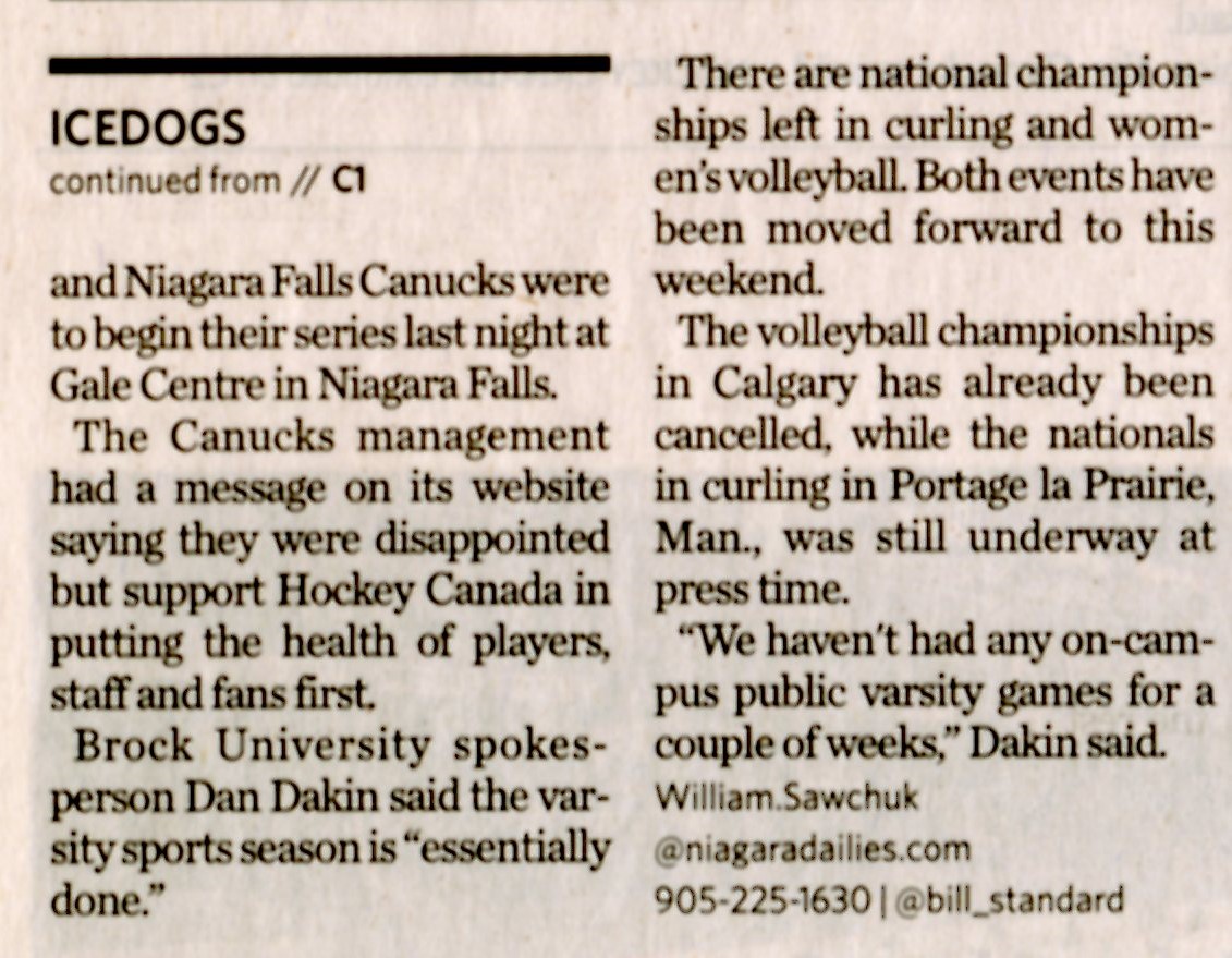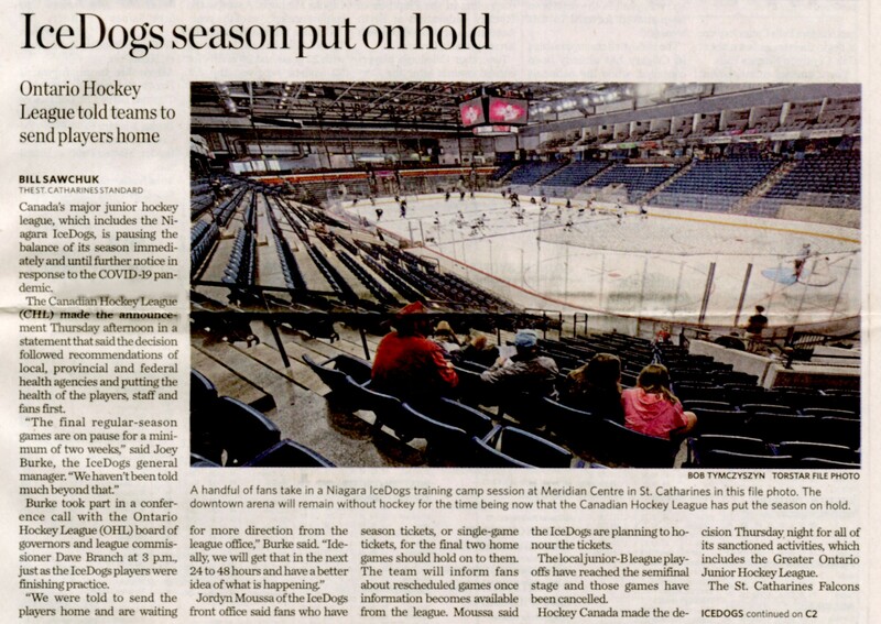 - IceDogs season put on hold : Ontario Hockey League told teams to send players home